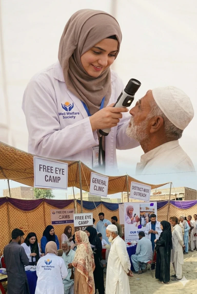 We provide free specialized camps offering Eye care, General check-ups, Pediatric (Children's), and Maternal & Child Health services to ensure comprehensive medical attention for all.